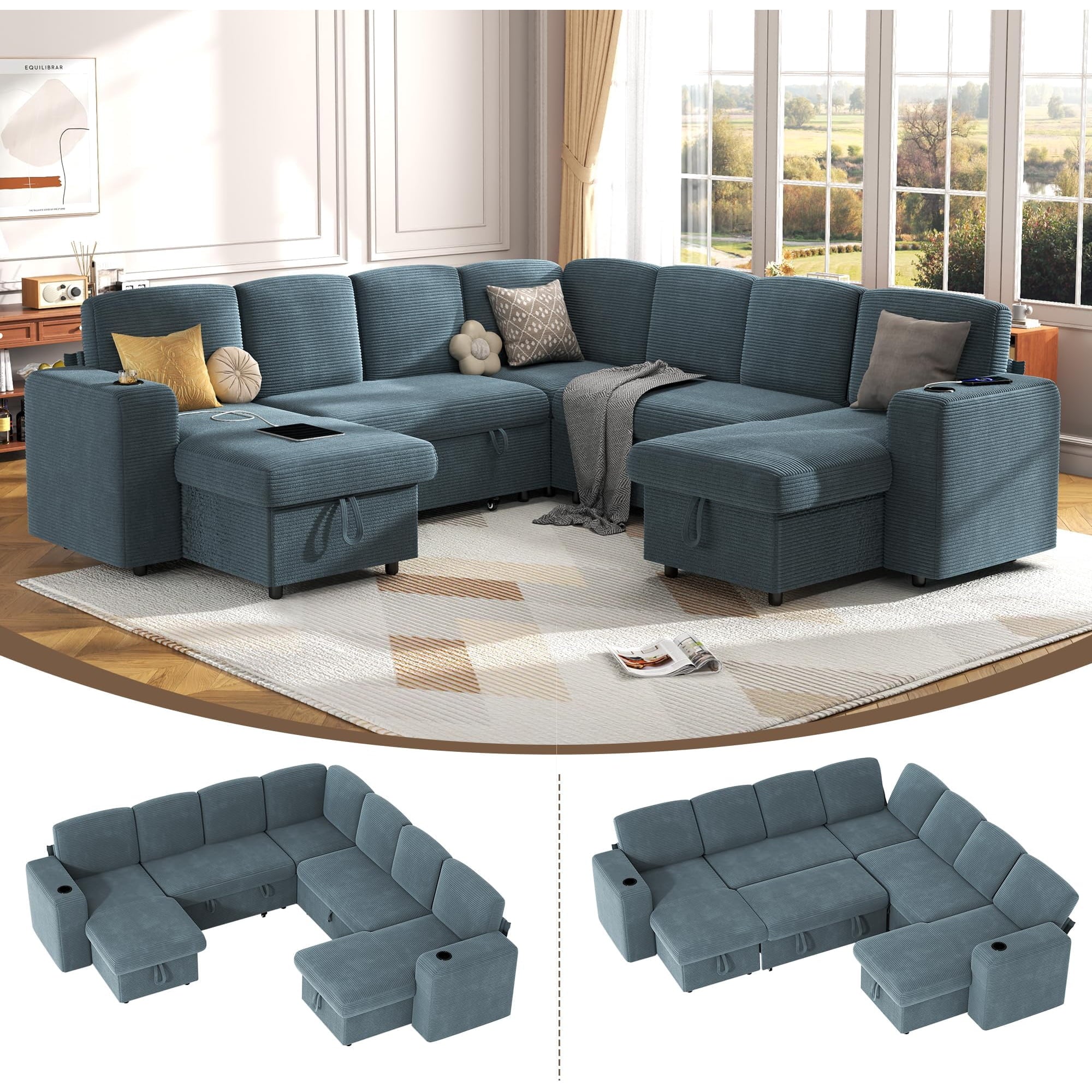 Pipleo 6 Seats Sectional Sleeper Sofa, Modular L Shaped Cloud Couch with Pull Out Sofa Bed, Storage Chaise, USB Charging, Adjustable Backrest