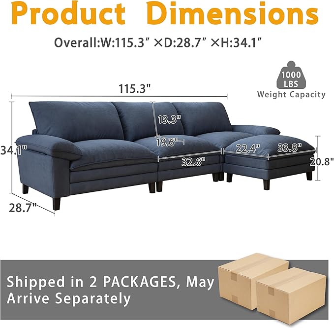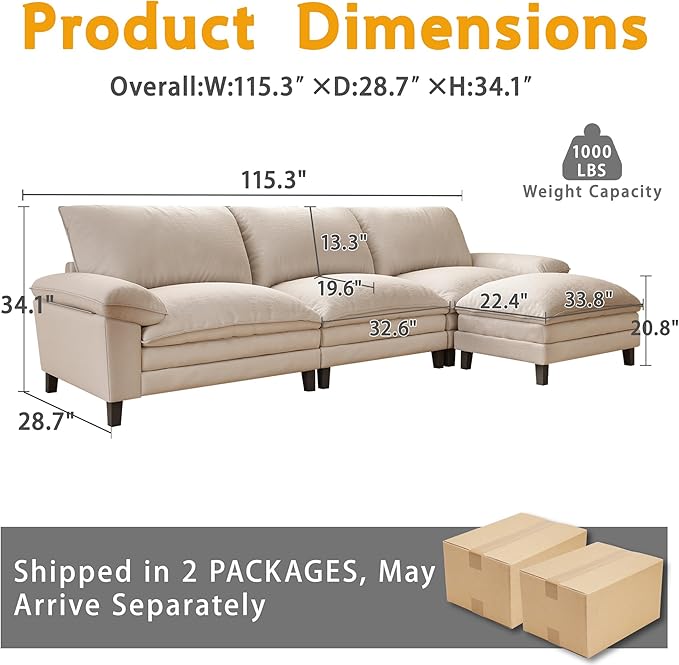 - 2 PACKAGES: The sectional couch set is delivered in two boxes. The cushions are vacuum-packed. After opening the package, please wait 48 hours to let it come back to its original shape for the better experience