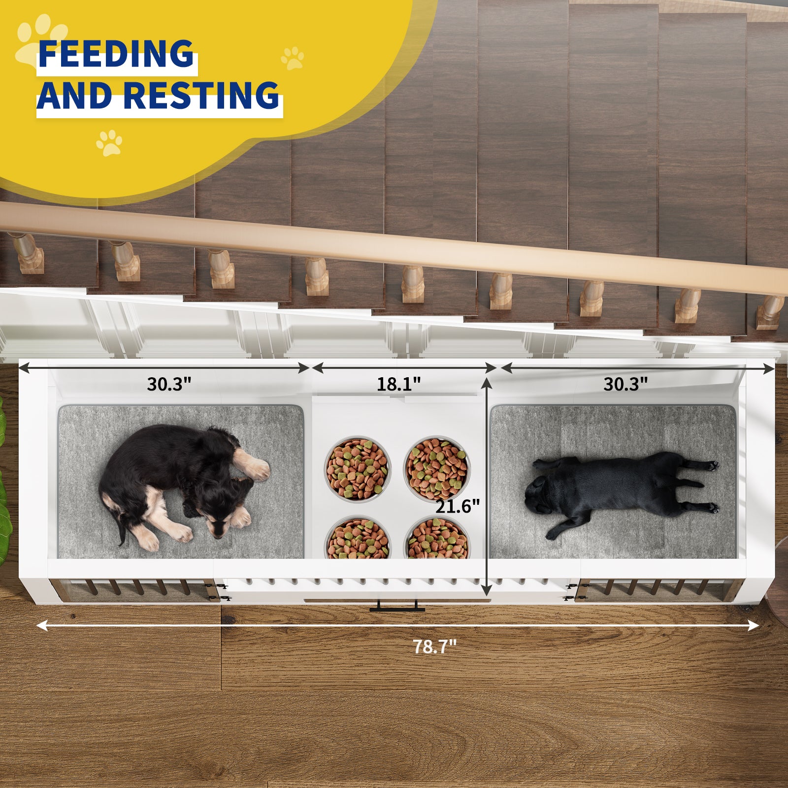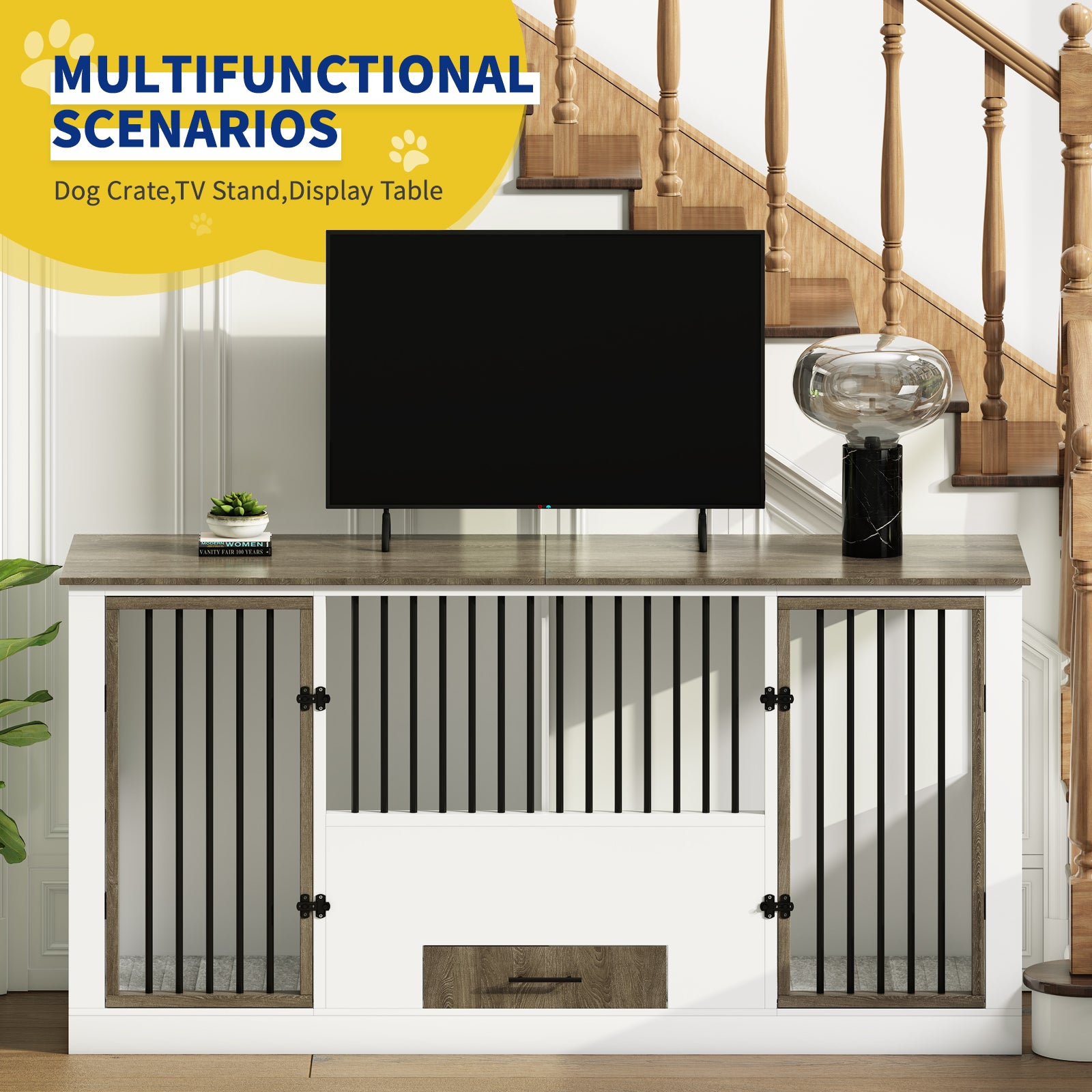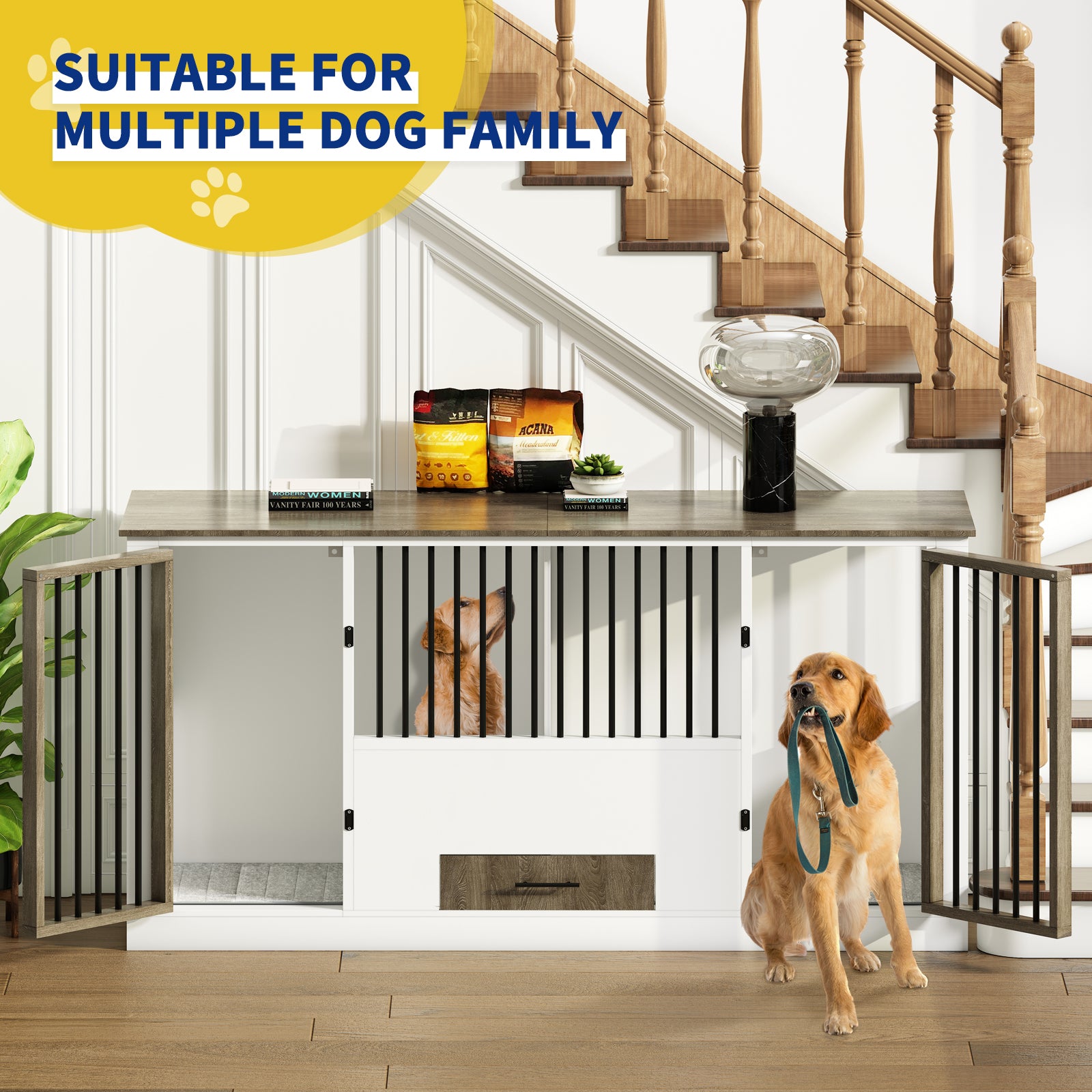 - DOG CAGE WITH 4 BOWLS: This large dog kennel furniture can provide a comfortable haven for your dog. Four bowls in the drawer make it easy for dogs to eat in or out of the crate.The large dog crate can be used as a TV stand and side table to save space. You can easily place decorations or items on the top. The classic and simple design will blend perfectly with your home decor.