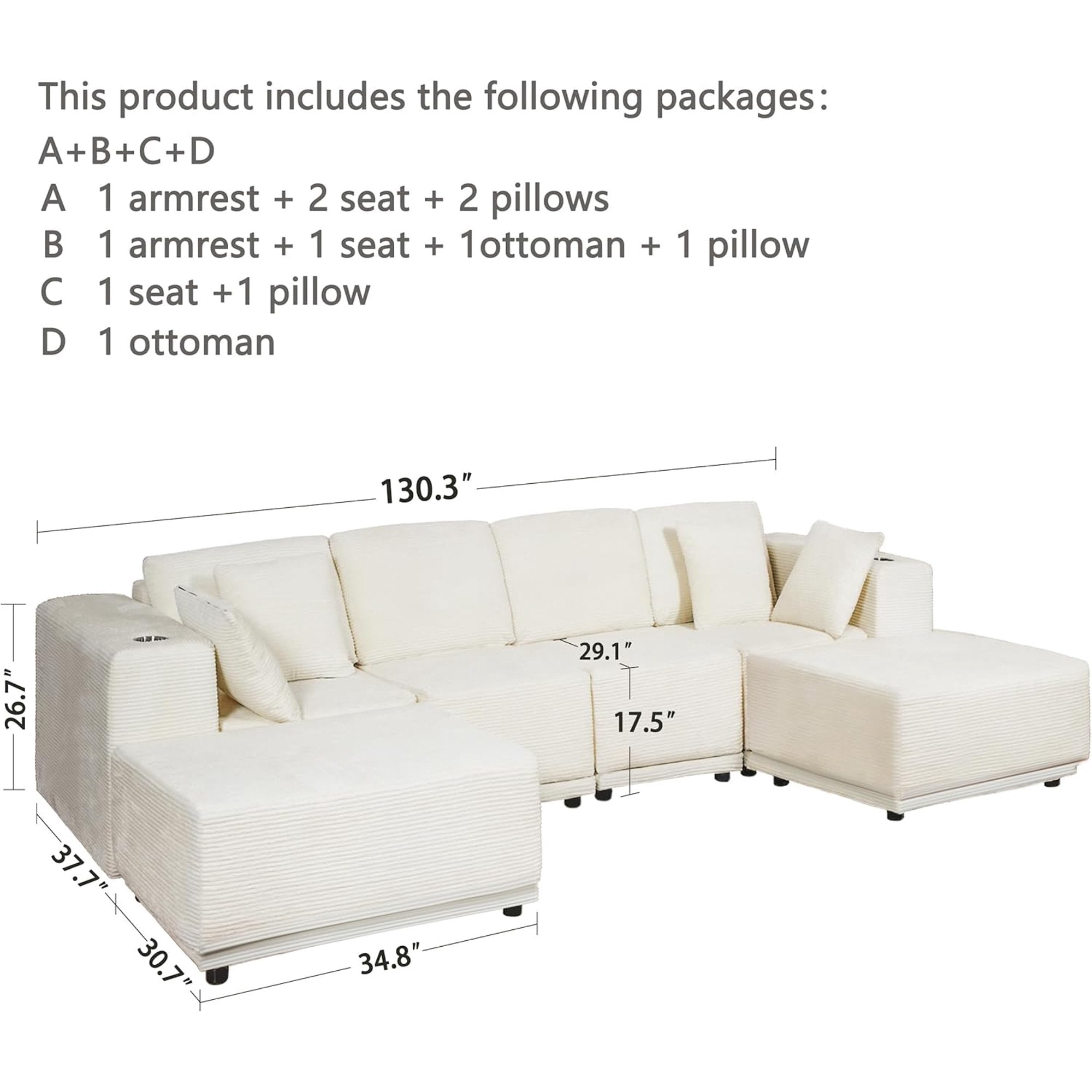 Akaber 130" Modular Sectional Sofa with U-Shape Chaise, 4-Seater Comfy Cloud Couch with Movable Ottoman, Deep Seat Couches for Living Room with Throw Pillows, White