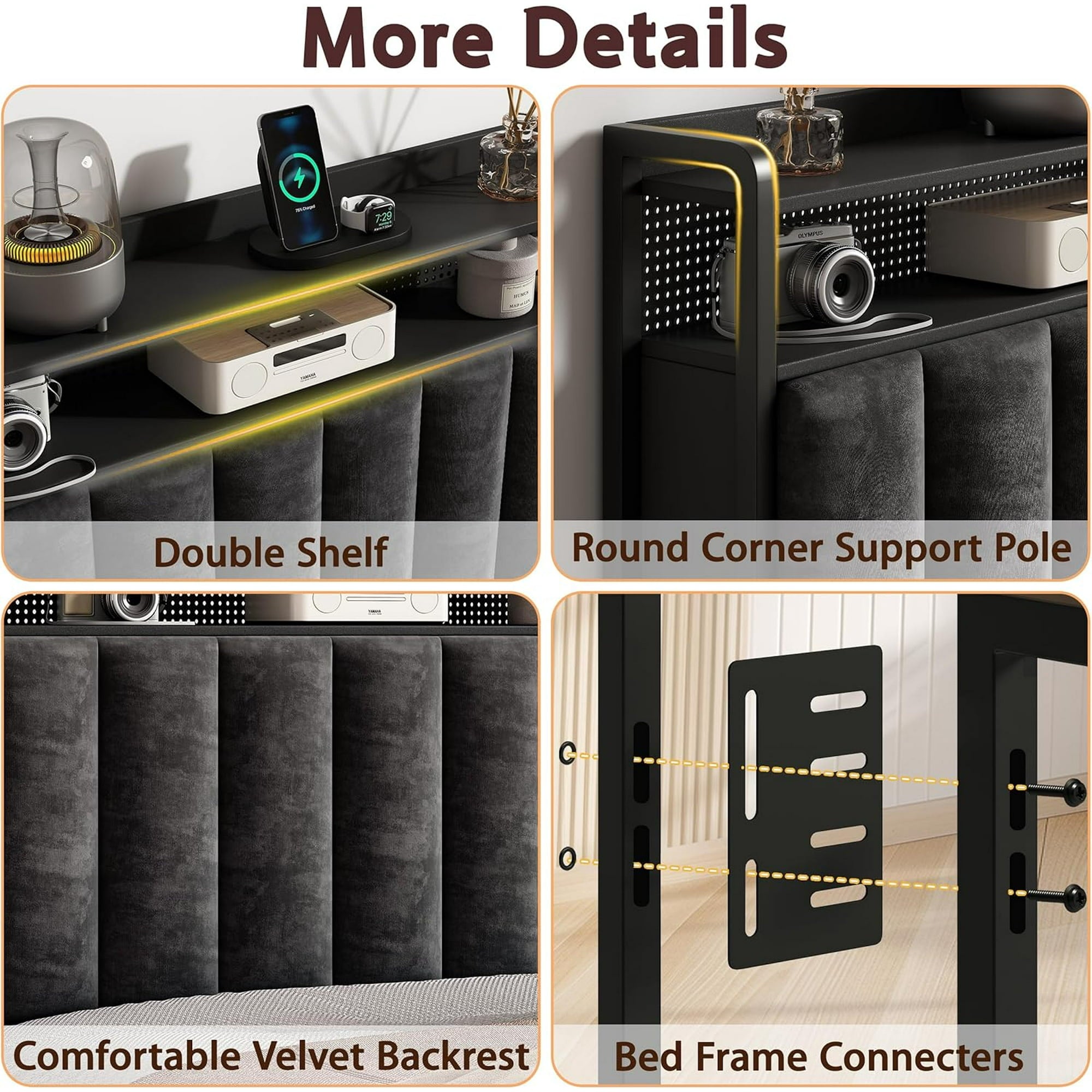 - Headboard with Charging Station: The King headboard only has 2 standard outlets and 2 USB ports built-in, you can charge your phone in bed at any time, conveniently charging your phone, tablet, smartwatch, lamp and other devices without having to get up and look for an outlet