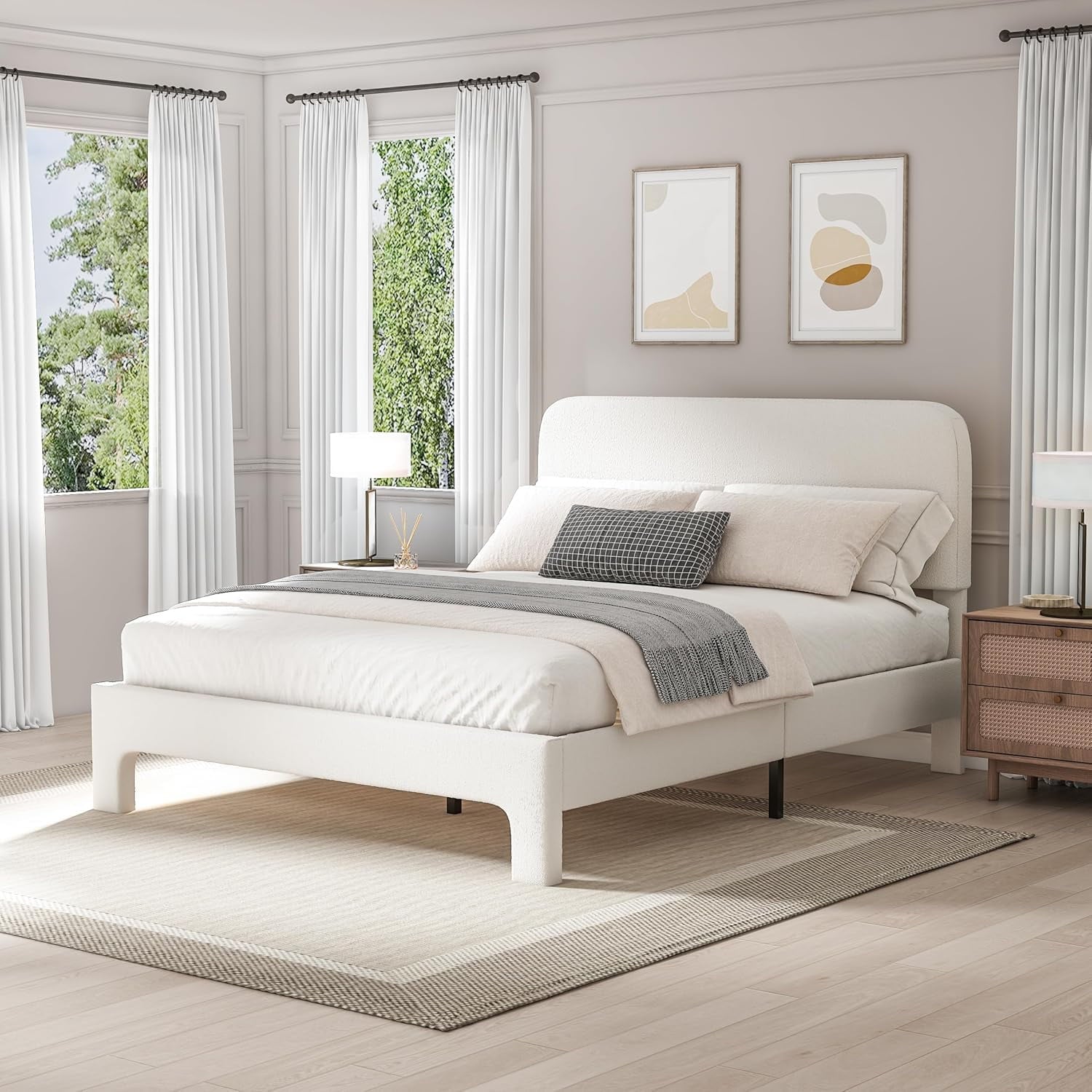 - Adjustable Headboard: This Queen Bed Frame comes with a soft and boucle headboard with 3 height levels designed to fit 6-12 inch thick mattresses and different users.