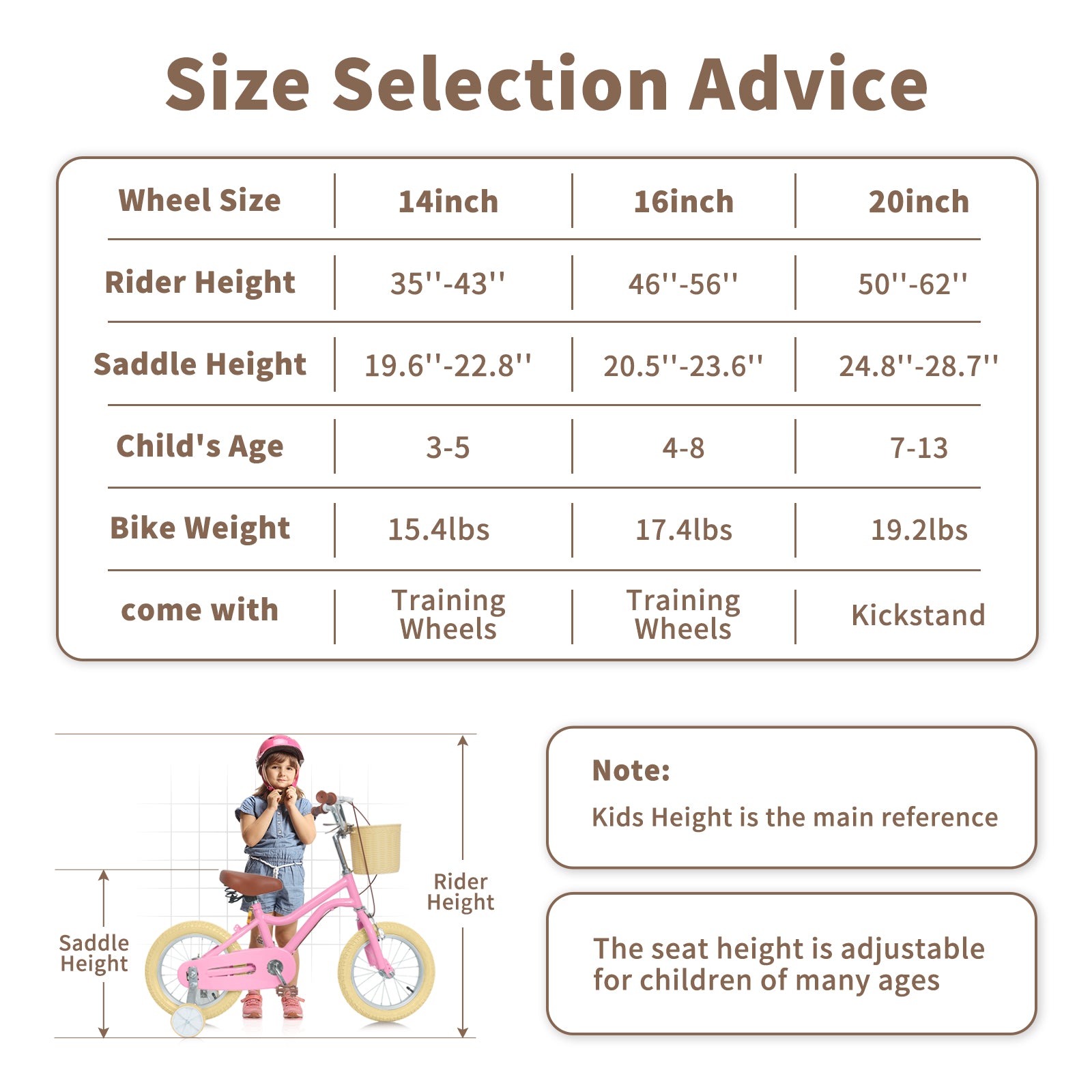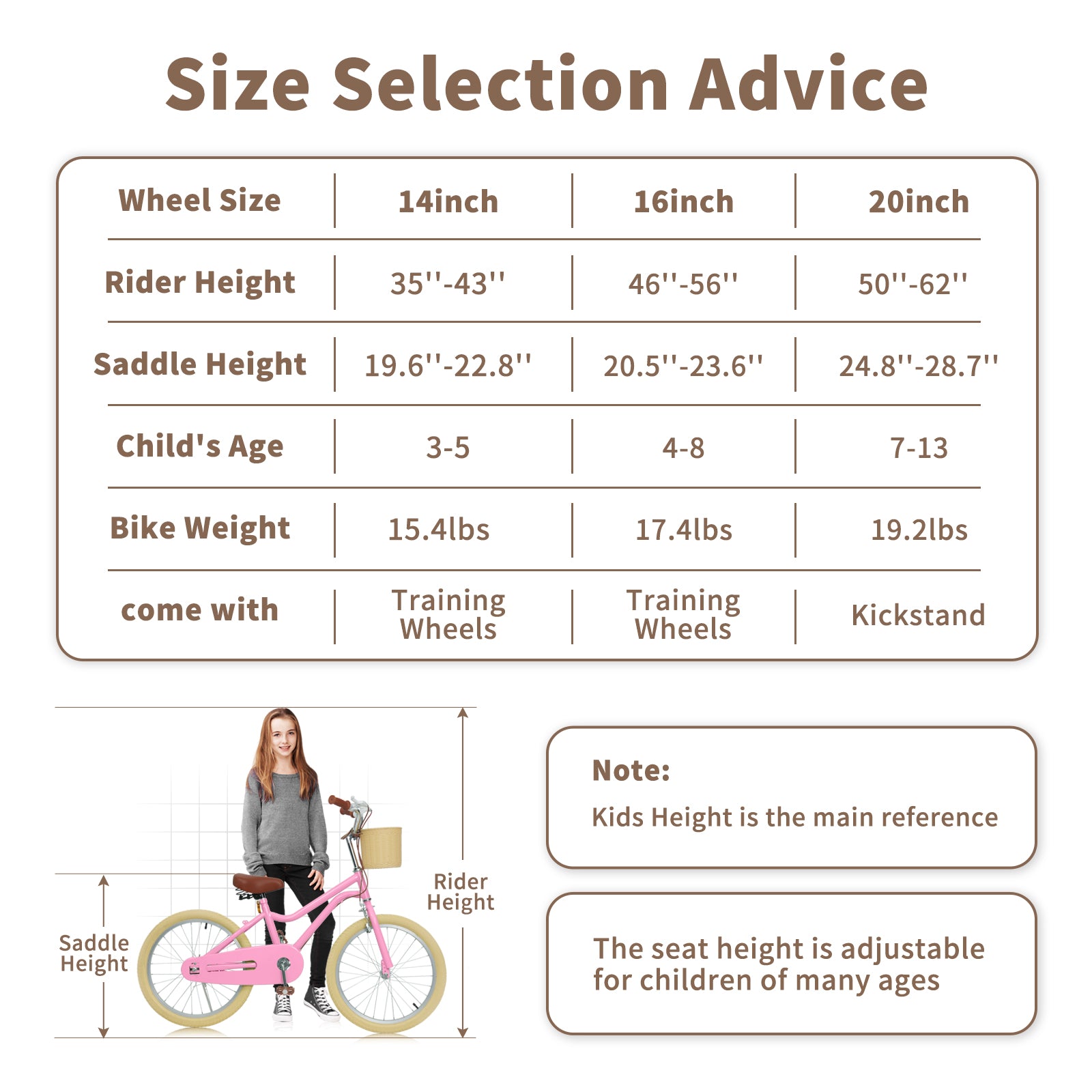 - 🚲Size Chart: 14in toddler girl bike fits kids 35''-43'', 16in girl bike fits kids 46''-56'', 20in girl bike fits kids 50''-62''. No matter what questions you have about our toddler bikes, please feel free to contact us, we will reply within 24 hours and try our best to solve all your questions.