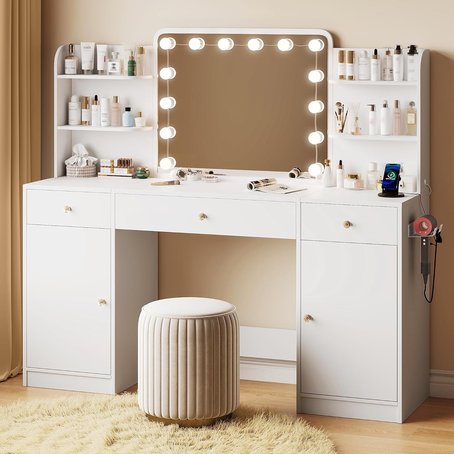 - ๐ Smart Charging Station: Big vanity includes hair dryer holder + USB charging station for simultaneous tool access and phone charging during styling.