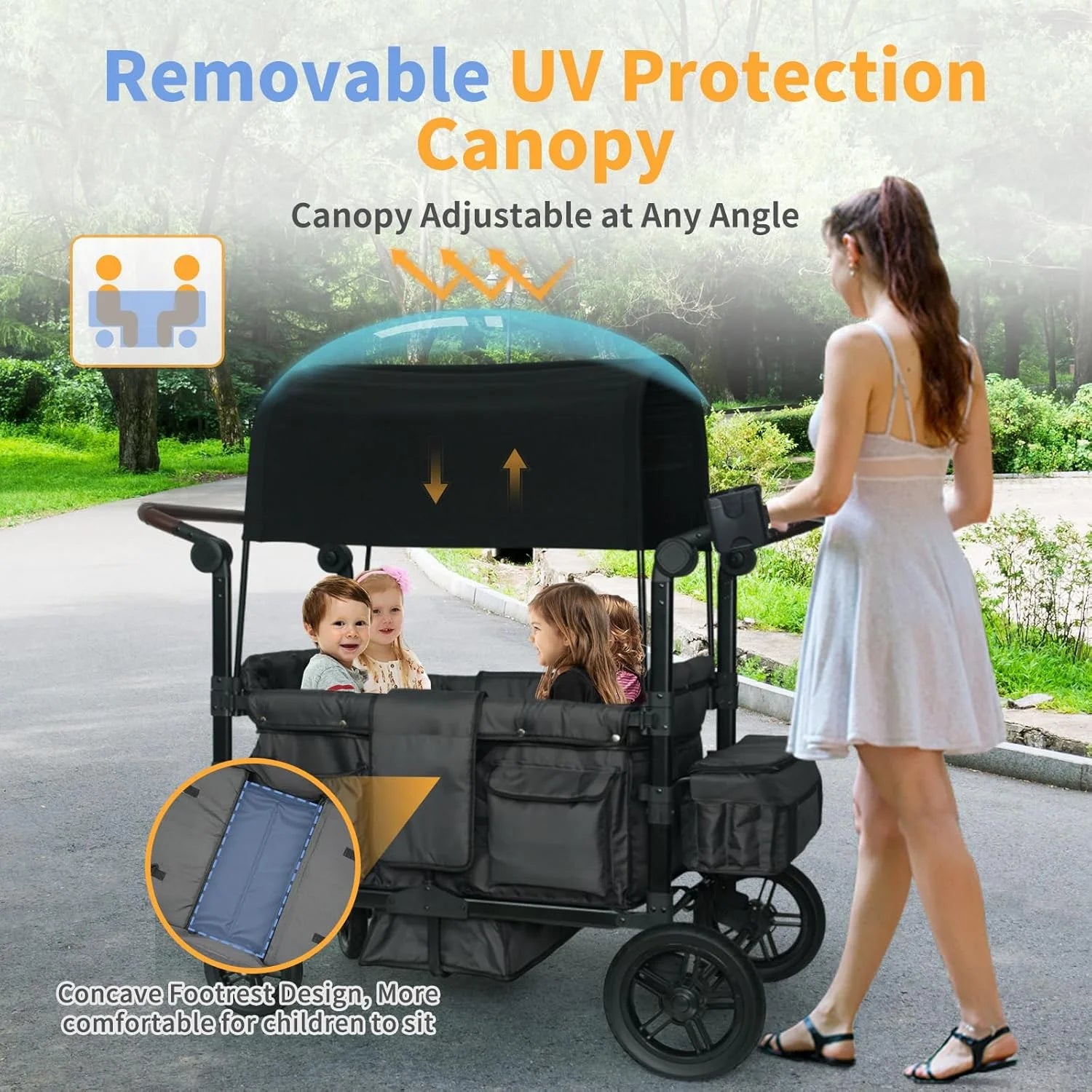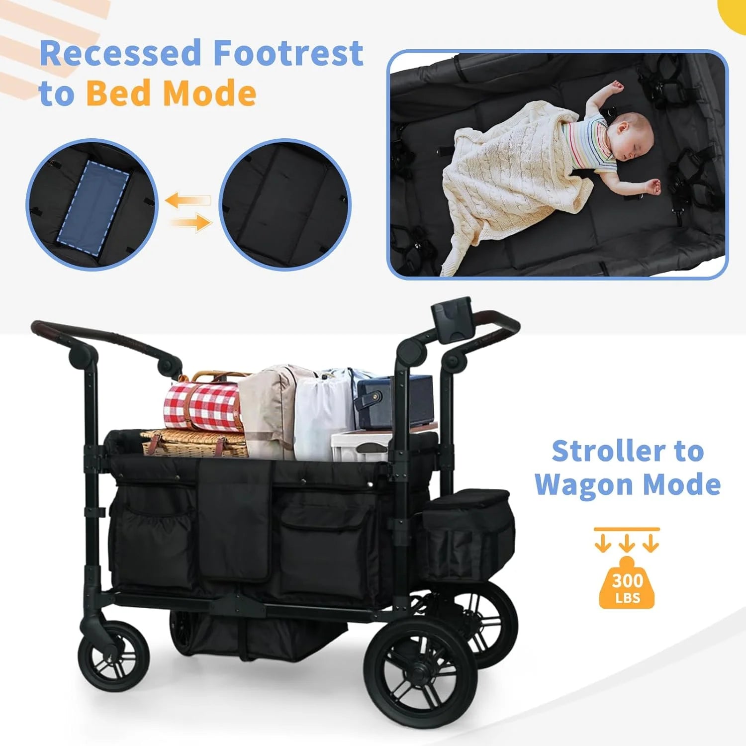 - 【Unique Design】Designed with a concave footrest and the bottom of the car can be laid flat as a crib and a stroller, five-point safety belt, adjustable and removable canopy, multiple storage bags, a water cup cell phone holder
